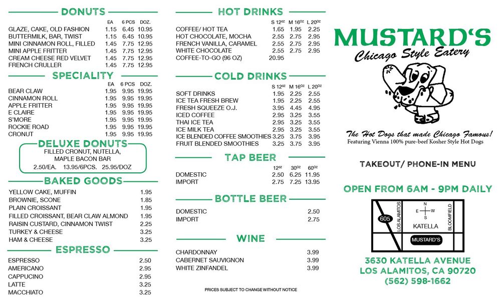 Welcome to Mustard’s Chicago Style Eatery, where classic flavors meet contemporary comfort in a casual setting. Located in Los Alamitos, CA, this eatery specializes in Chicago-style hot dogs, enticing burgers, and hearty sandwiches. The menu features standout items like the Angus Burger and the Chili Cheeseburger, both crafted with top-notch ingredients that promise satisfaction in every bite.